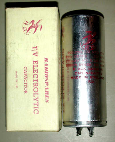 100 + 200 + 200µF 350V Electrolytic. Reformed and tested. Unused Radiospares TV Electrolytic.
